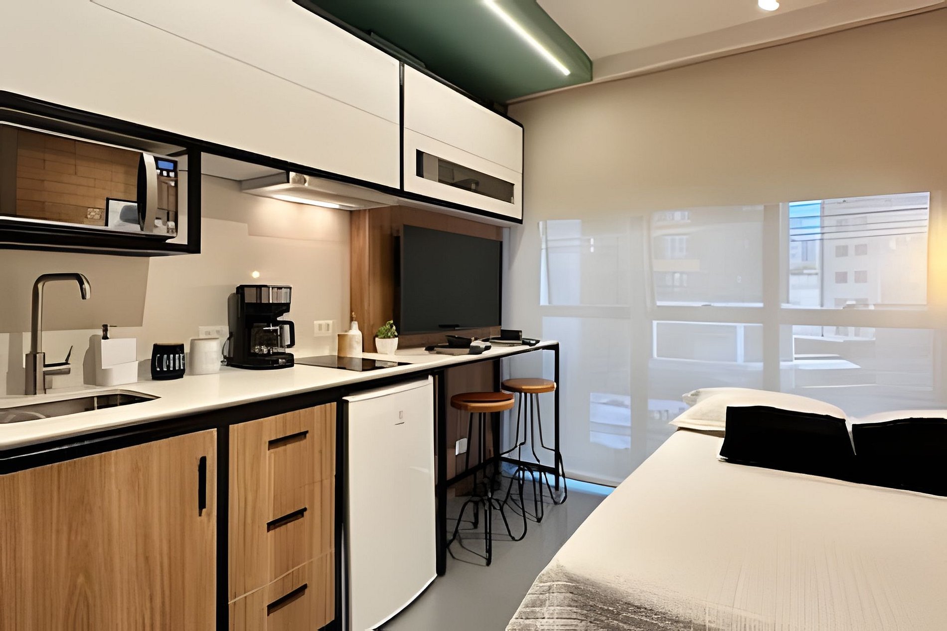 O prédio conta com um espaço de Coworking, que poderá ser utilizado pelos hóspedes mediante agendamento e pagamento do mesmo, bem como uso da lavanderia com máquinas da OMO.
