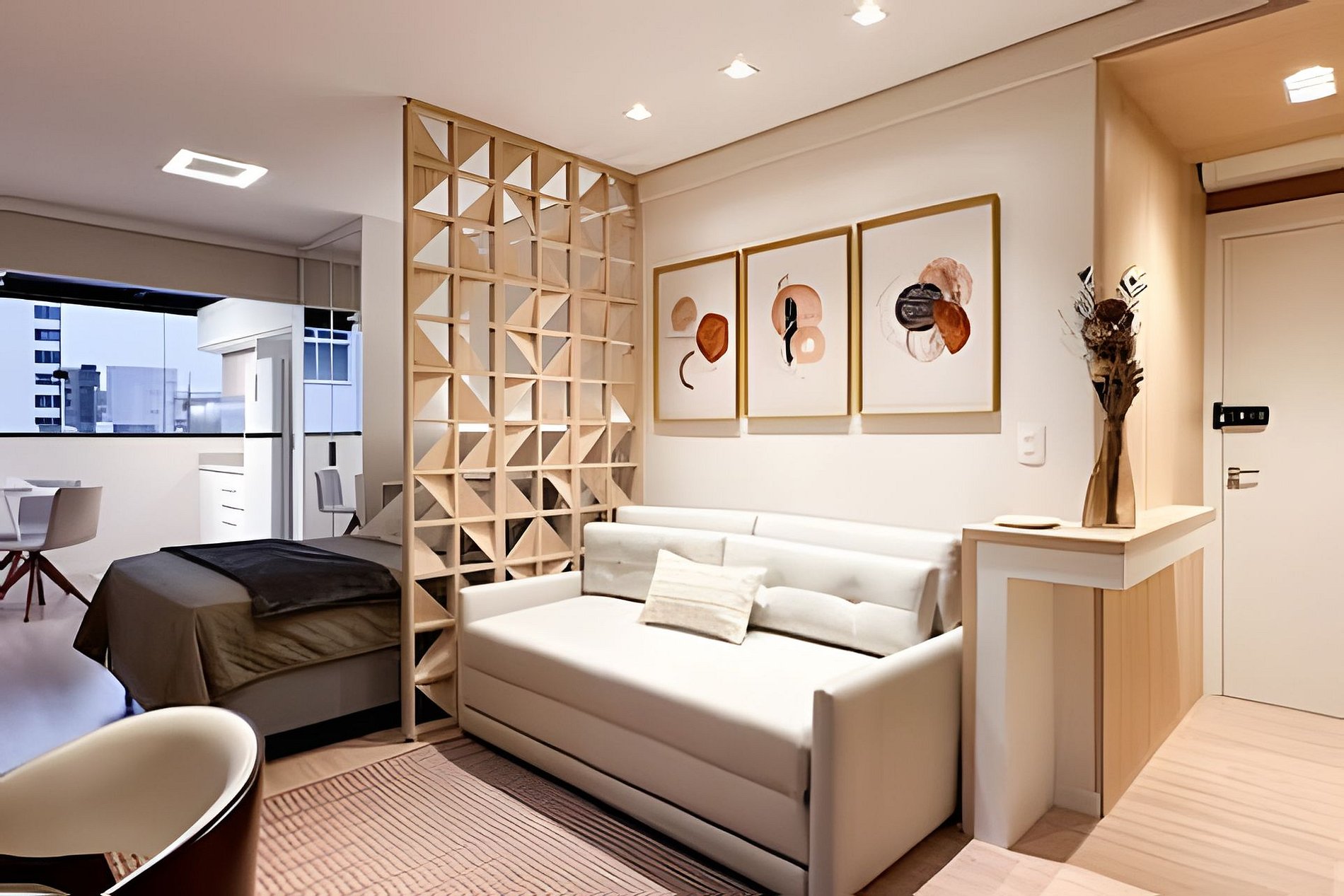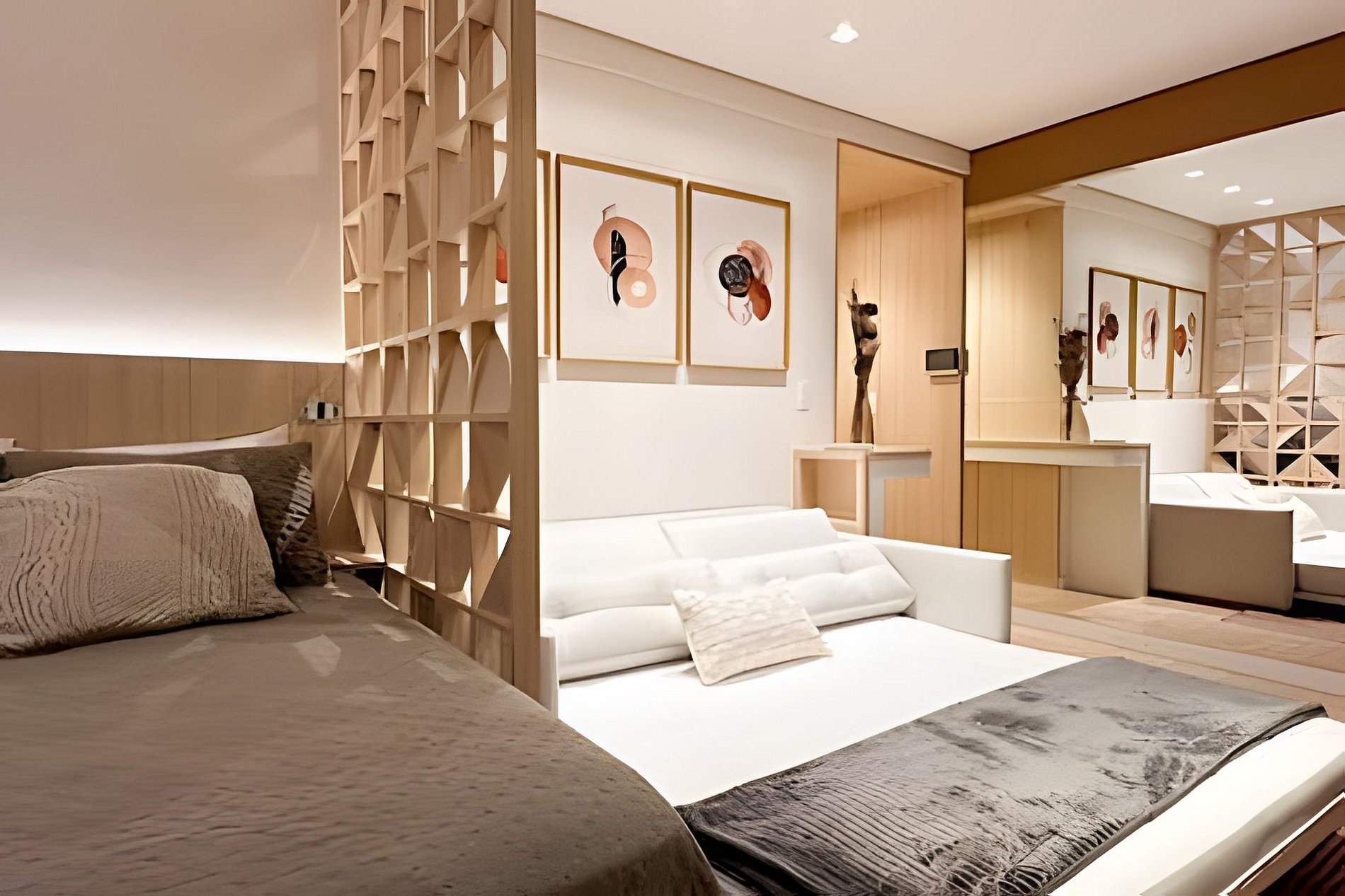 > Studio Completo: Você terá todo o studio à sua disposição, projetado para oferecer conforto e praticidade, com uma decoração moderna e todos os itens essenciais para uma estadia confortável.