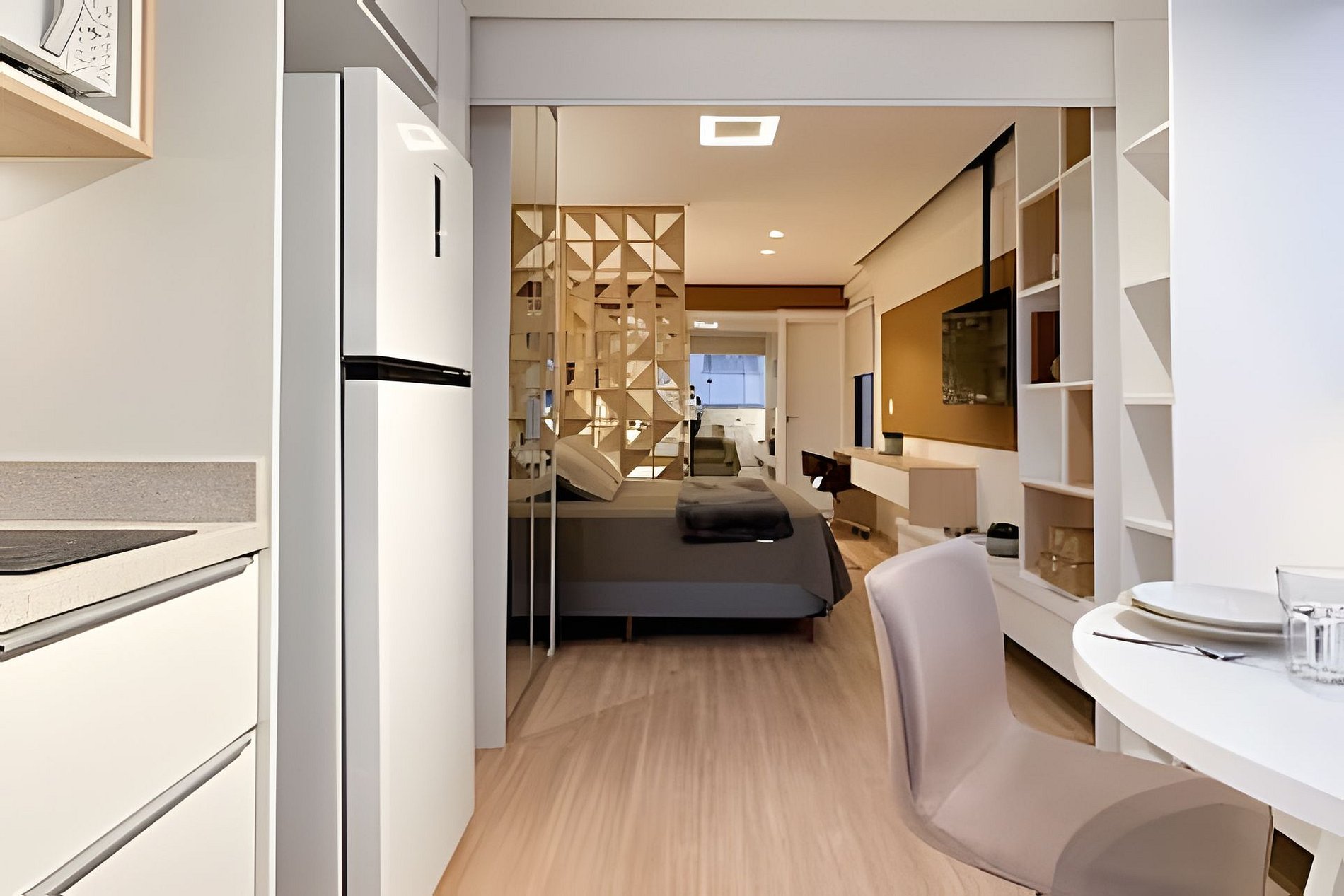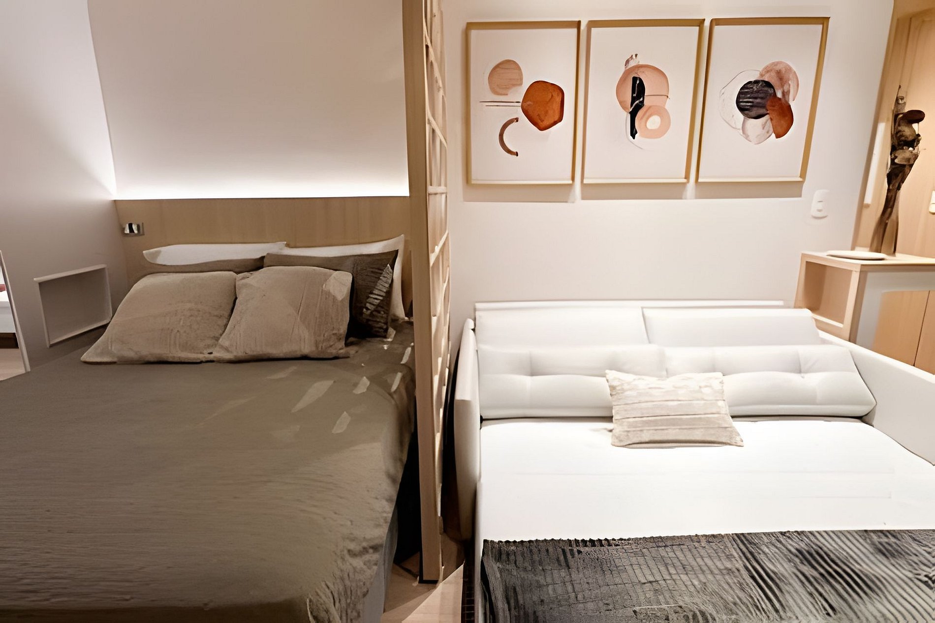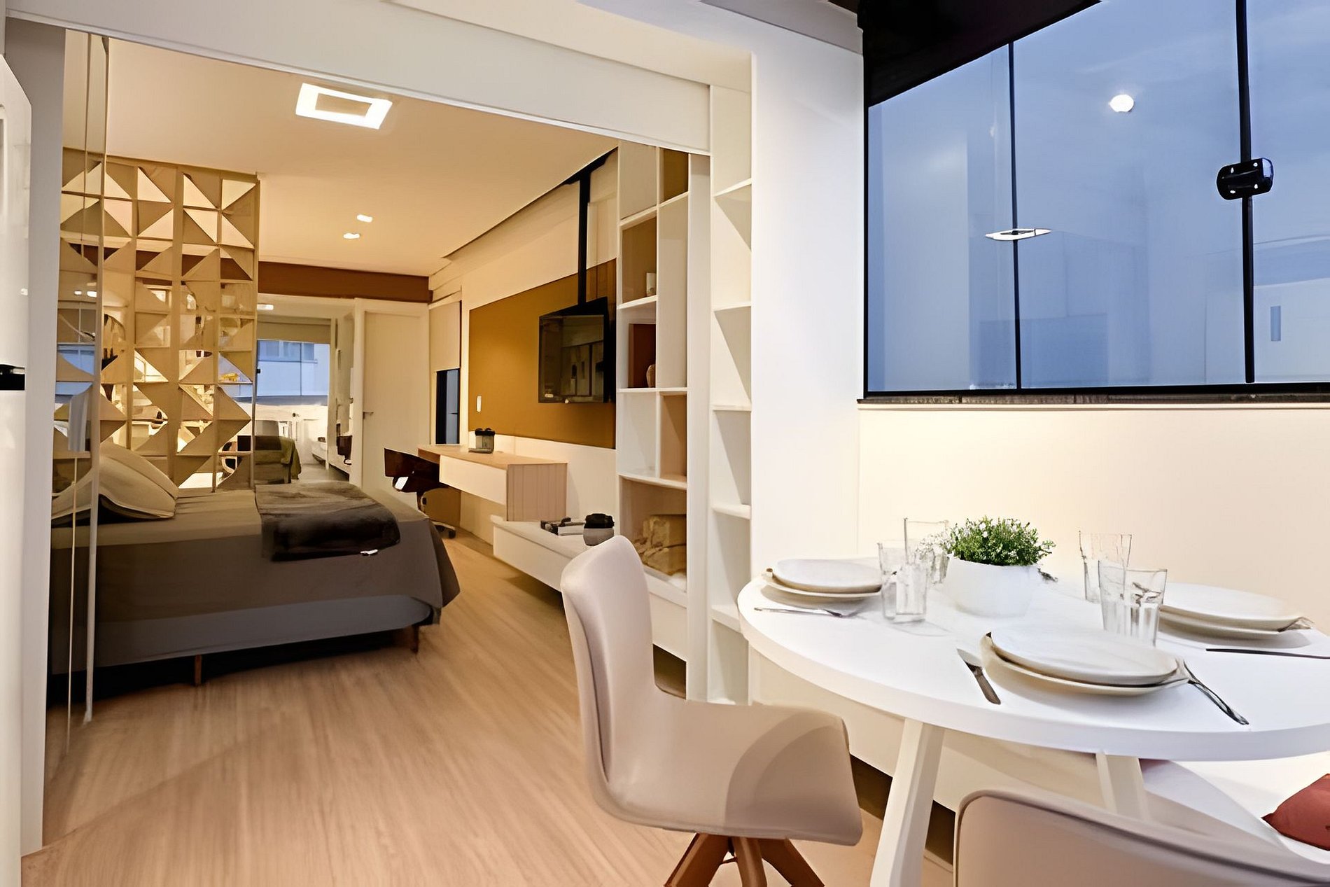 Cada detalhe aqui é pensado para proporcionar uma estadia confortável e prática. Acomode-se em um ambiente moderno e funcional, repleto de comodidades. Itens fornecidos durante a estadia: > Jogo completo de banho: 02 toalhas de banho 70x140cm 02 toalhas de rosto 48x85cm 01 tapete para banheiro 48x80cm > Jogo completo de cama: 01 lençol com elástico 01 lençol sem elástico 02 fronhas 04 travesseiros 40x60cm 01 cobre leito com 2 fronhas 01 manta de microfibra tamanho casal > Itens de higiene: 01 sabonete corporal 40g | Realgems | Melão e Jasmim 01 shampoo 40 a 60ml | Pérola linha profissional 01 condicionador 40 a 60ml | Pérola linha profissional 02 cotonetes + 02 algodões 01 rolo de papel higiênico Equipamentos e utensílios disponíveis no studio: Louças e talheres: 06 copos de água 02 taças de espumante 02 taças de vinho 02 xícaras grandes 02 xícaras de café 01 travessa 04 pratos de jantar 04 pratos de sobremesa 02 bowls 06 facas de mesa 06 garfos de mesa 06 colheres de sopa 06 garfos de sobremesa 06 colheres de café Utensílios de cozinha: 01 faca de corte 01 tesoura 01 abridor de vinho 02 conchas de silicone 01 colher de silicone 01 pegador de massa de silicone 01 pegador de silicone 01 espumadeira reta de silicone 01 fouet de silicone 03 panelas com tampas 01 frigideira 01 tábua de corte Eletrodomésticos: 01 secador de cabelo 01 ferro de passar roupa 01 sanduicheira 01 cafeteira elétrica 01 chaleira elétrica Acessórios: 01 rodinho de pia 02 jogos americanos 01 vassoura 01 rodo 01 balde 01 pá 06 cabides > Comodidades do estúdio: Cama de casal padrão 138x188cm Cooktop de indução 02 bocas Persiana rolo black-out TV Smart com canais abertos Sofá cama com colchão queen Ar condicionado quente/frio