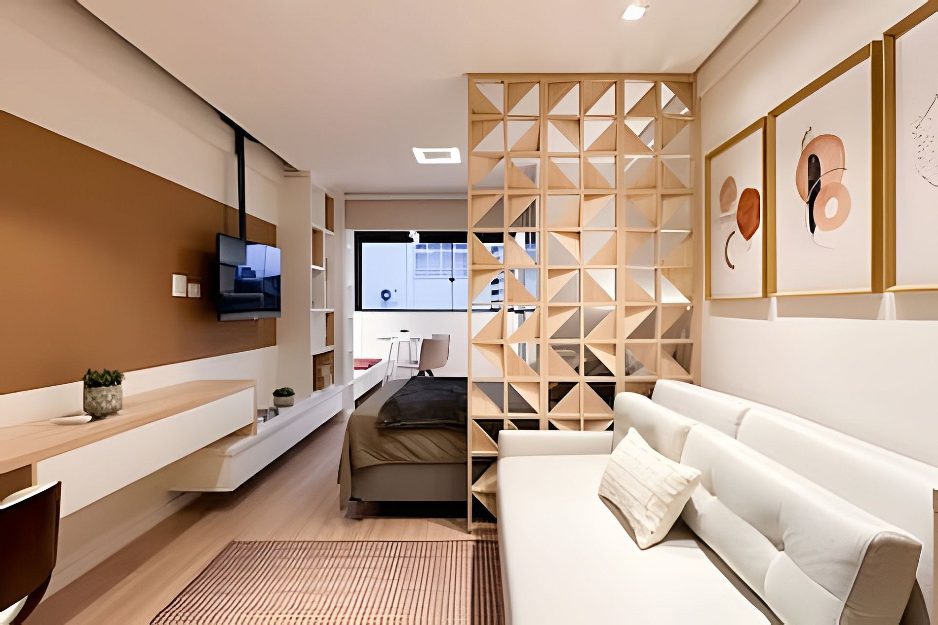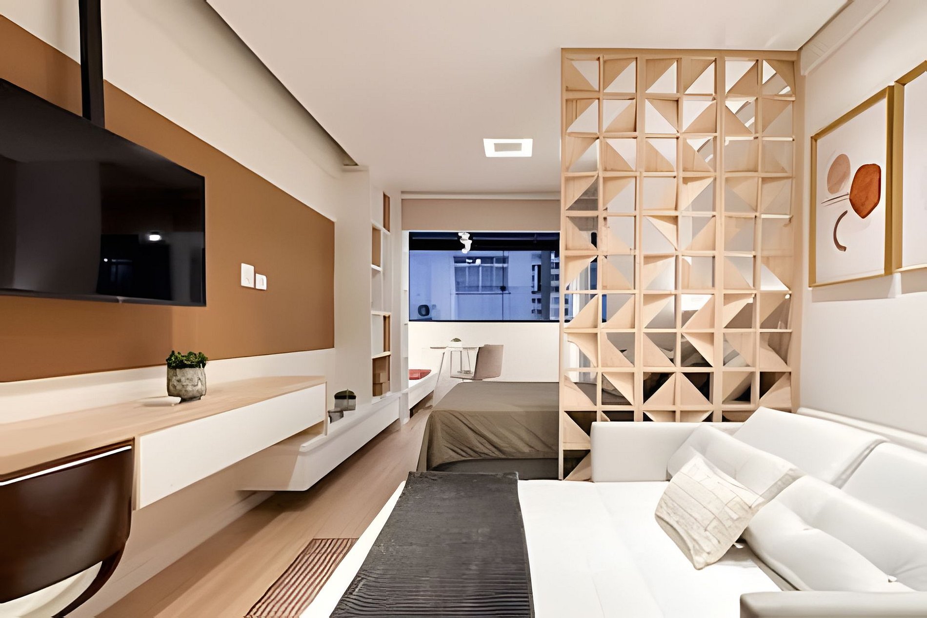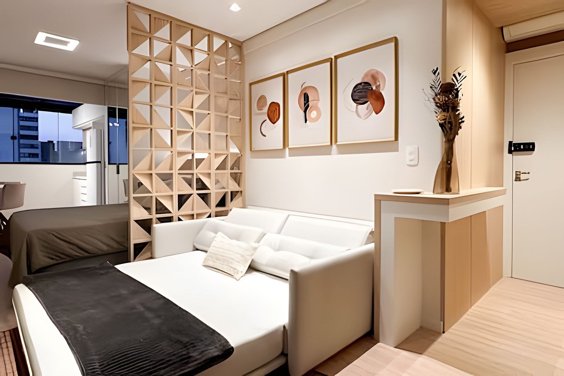 Cada detalhe aqui é pensado para proporcionar uma estadia confortável e prática. Acomode-se em um ambiente moderno e funcional, repleto de comodidades. Itens fornecidos durante a estadia: > Jogo completo de banho: 02 toalhas de banho 70x140cm 02 toalhas de rosto 48x85cm 01 tapete para banheiro 48x80cm > Jogo completo de cama: 01 lençol com elástico 01 lençol sem elástico 02 fronhas 04 travesseiros 40x60cm 01 cobre leito com 2 fronhas 01 manta de microfibra tamanho casal > Itens de higiene: 01 sabonete corporal 40g | Realgems | Melão e Jasmim 01 shampoo 40 a 60ml | Pérola linha profissional 01 condicionador 40 a 60ml | Pérola linha profissional 02 cotonetes + 02 algodões 01 rolo de papel higiênico Equipamentos e utensílios disponíveis no studio: Louças e talheres: 06 copos de água 02 taças de espumante 02 taças de vinho 02 xícaras grandes 02 xícaras de café 01 travessa 04 pratos de jantar 04 pratos de sobremesa 02 bowls 06 facas de mesa 06 garfos de mesa 06 colheres de sopa 06 garfos de sobremesa 06 colheres de café Utensílios de cozinha: 01 faca de corte 01 tesoura 01 abridor de vinho 02 conchas de silicone 01 colher de silicone 01 pegador de massa de silicone 01 pegador de silicone 01 espumadeira reta de silicone 01 fouet de silicone 03 panelas com tampas 01 frigideira 01 tábua de corte Eletrodomésticos: 01 secador de cabelo 01 ferro de passar roupa 01 sanduicheira 01 cafeteira elétrica 01 chaleira elétrica Acessórios: 01 rodinho de pia 02 jogos americanos 01 vassoura 01 rodo 01 balde 01 pá 06 cabides > Comodidades do estúdio: Cama de casal padrão 138x188cm Cooktop de indução 02 bocas Persiana rolo black-out TV Smart com canais abertos Sofá cama com colchão queen Ar condicionado quente/frio