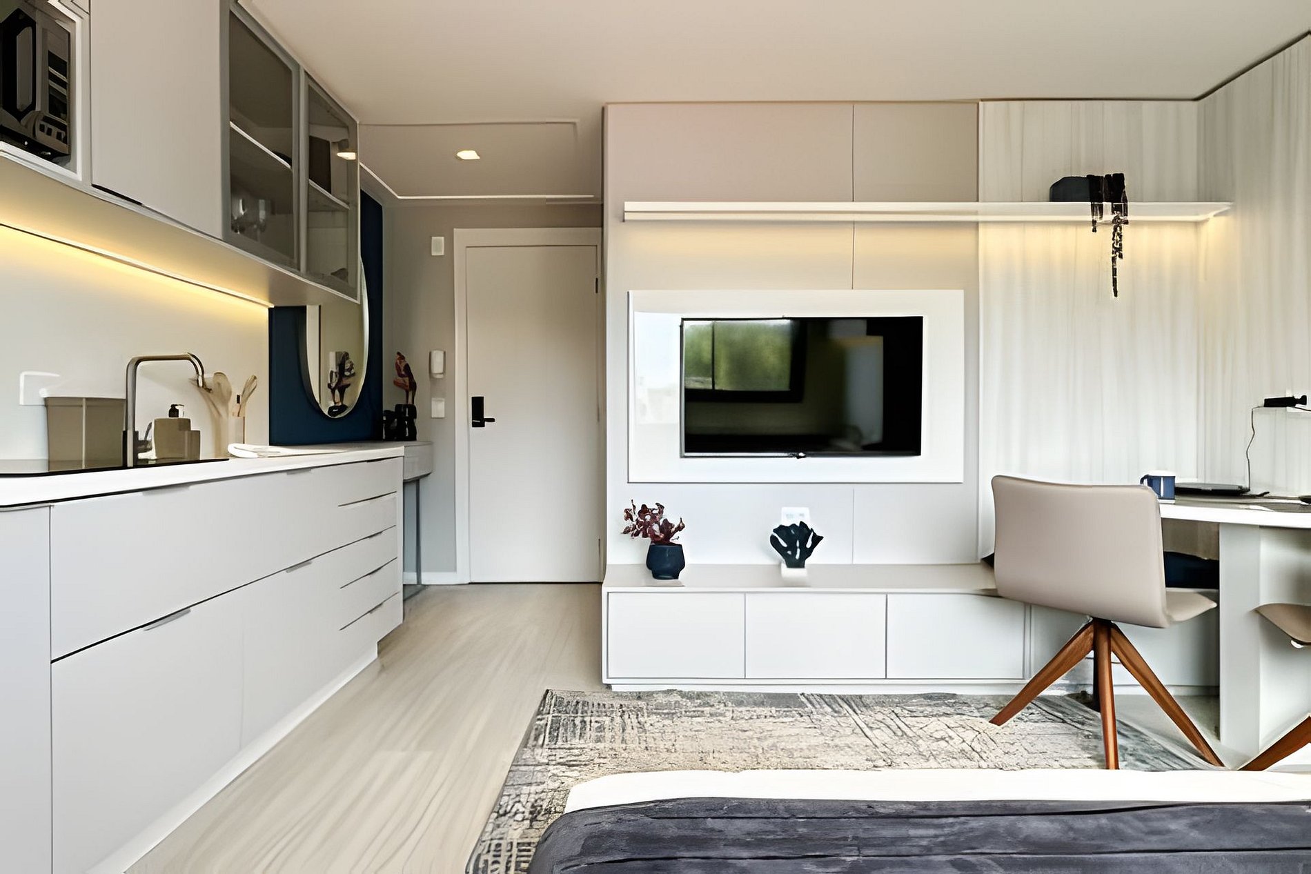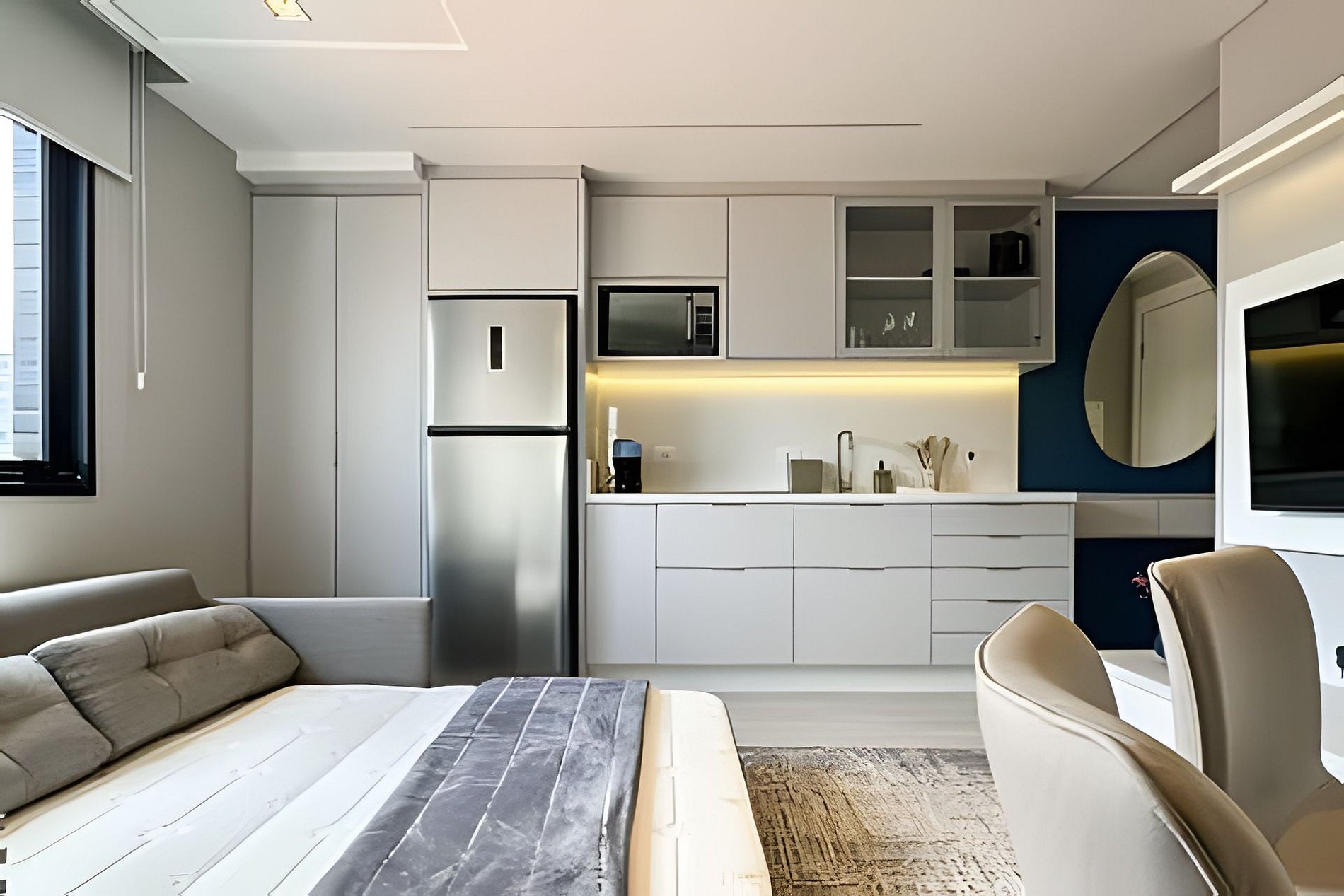 > Studio Completo: Você terá todo o studio à sua disposição, projetado para oferecer conforto e praticidade, com uma decoração moderna e todos os itens essenciais para uma estadia confortável.