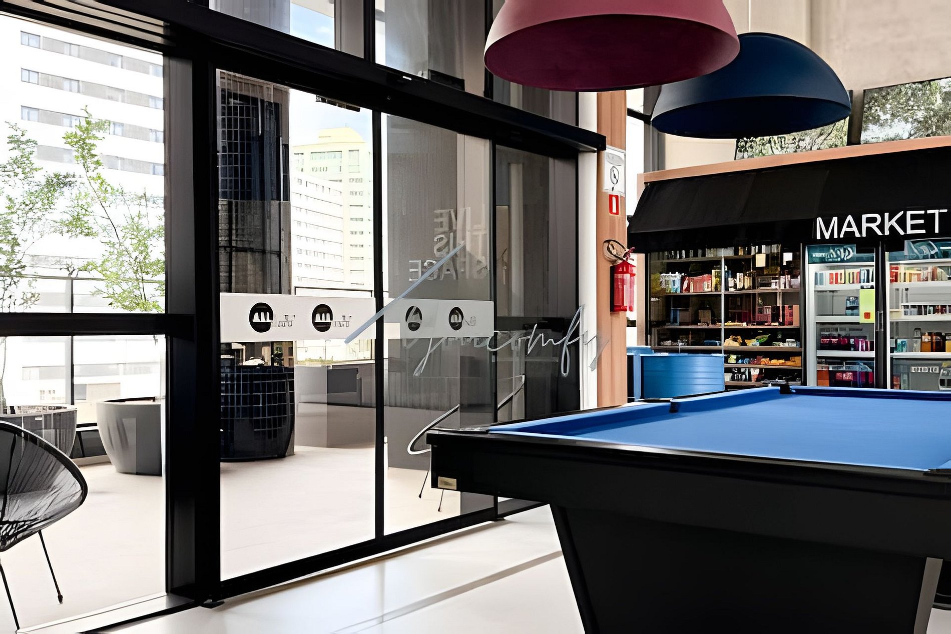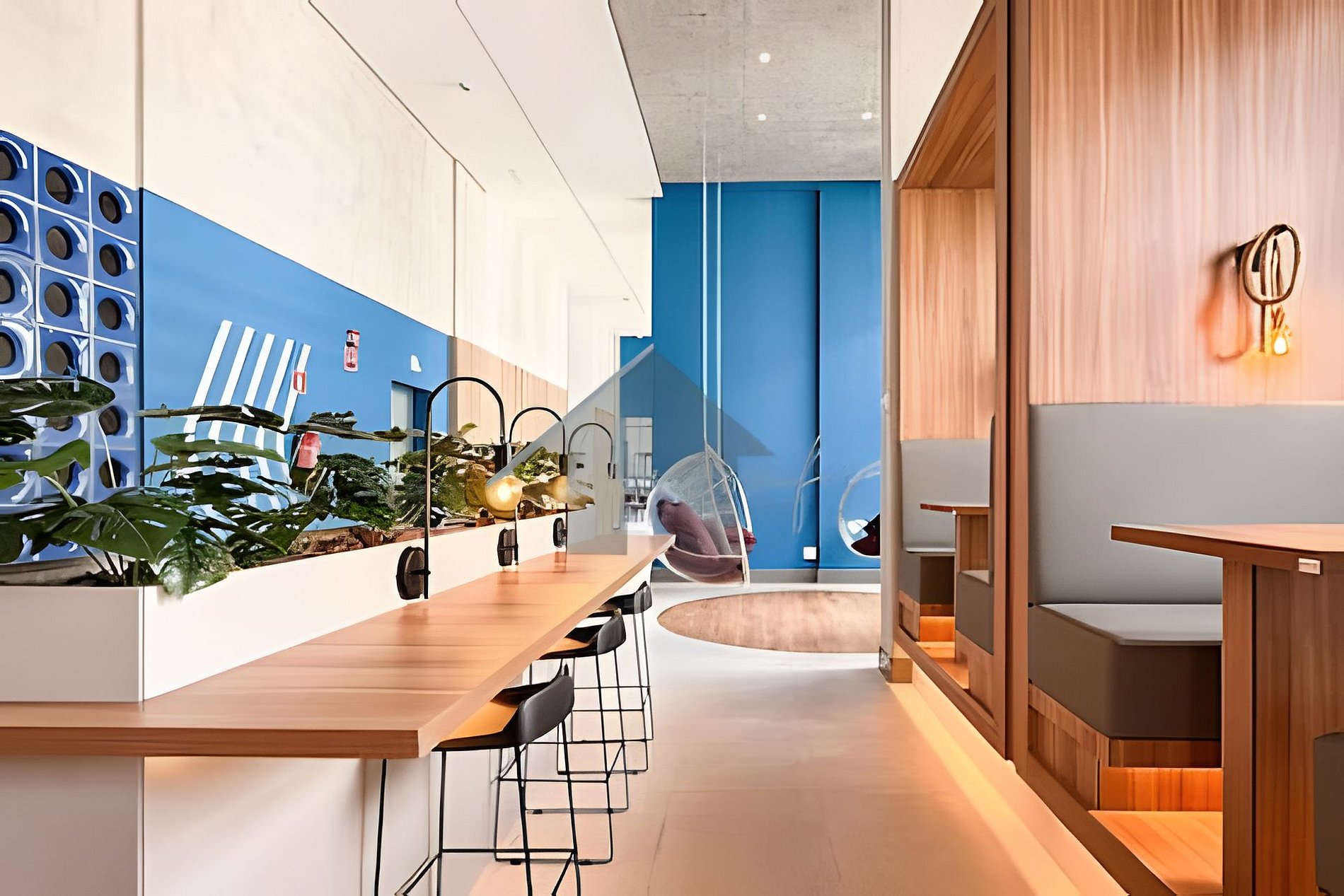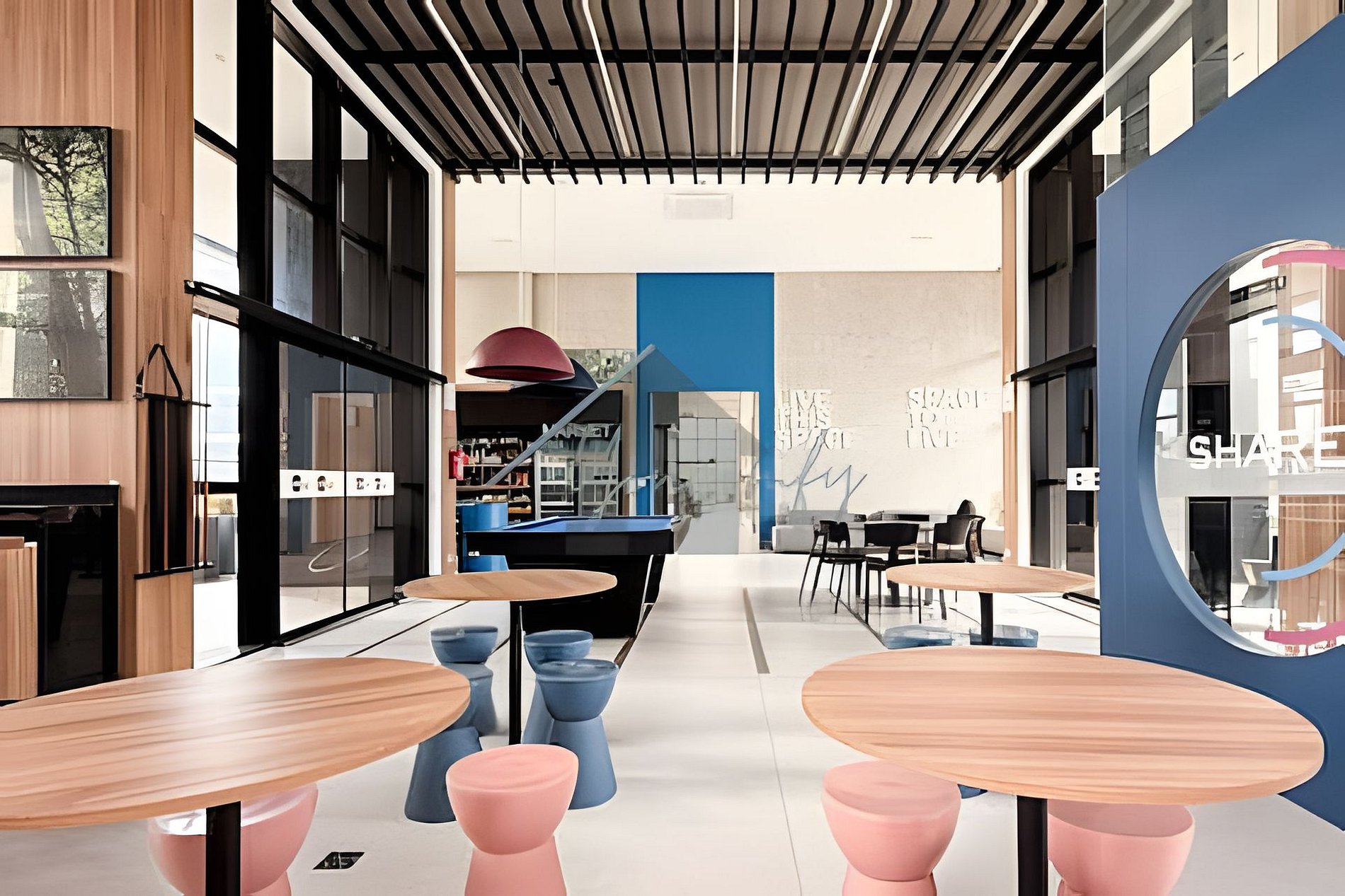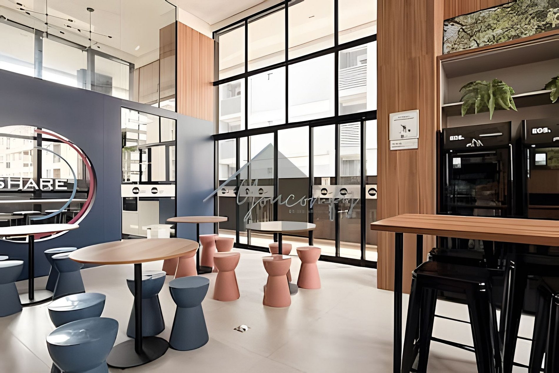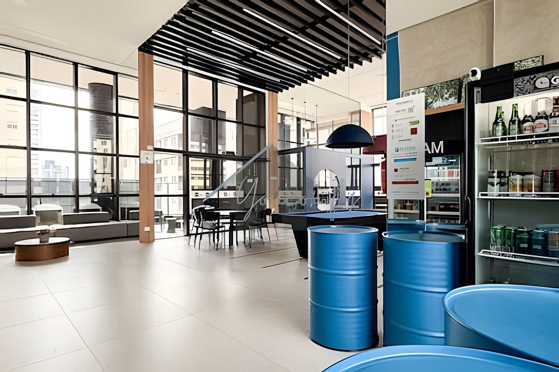> Coworking: Aberto 24hrs por dia, em um amplo espaço com mesas, banquetas e puffs.