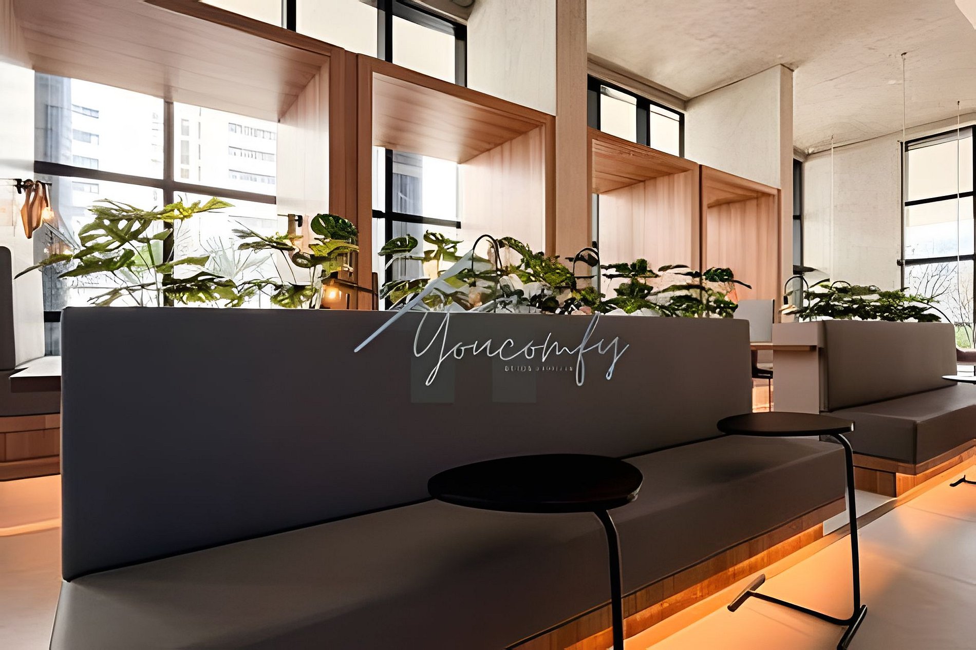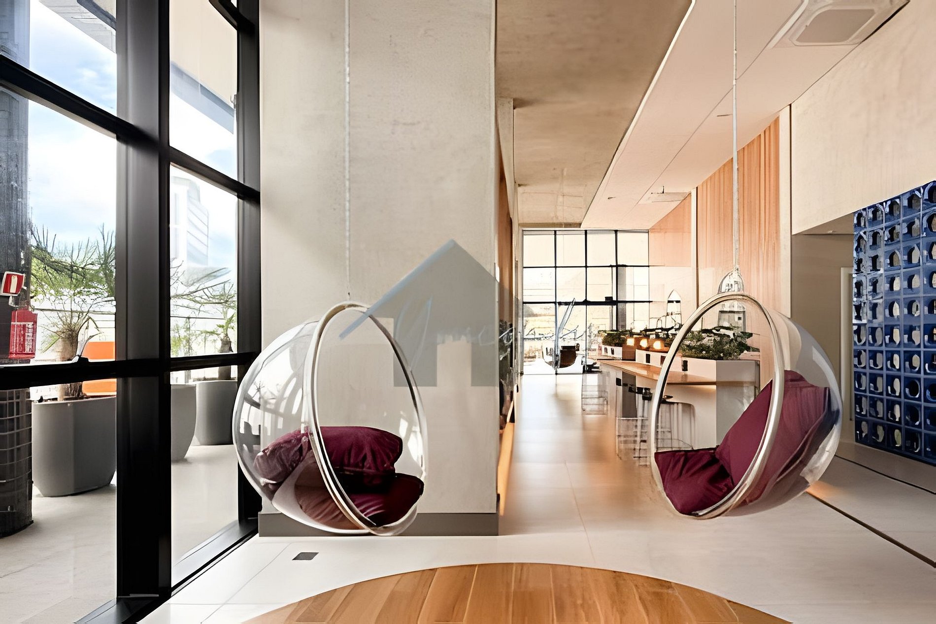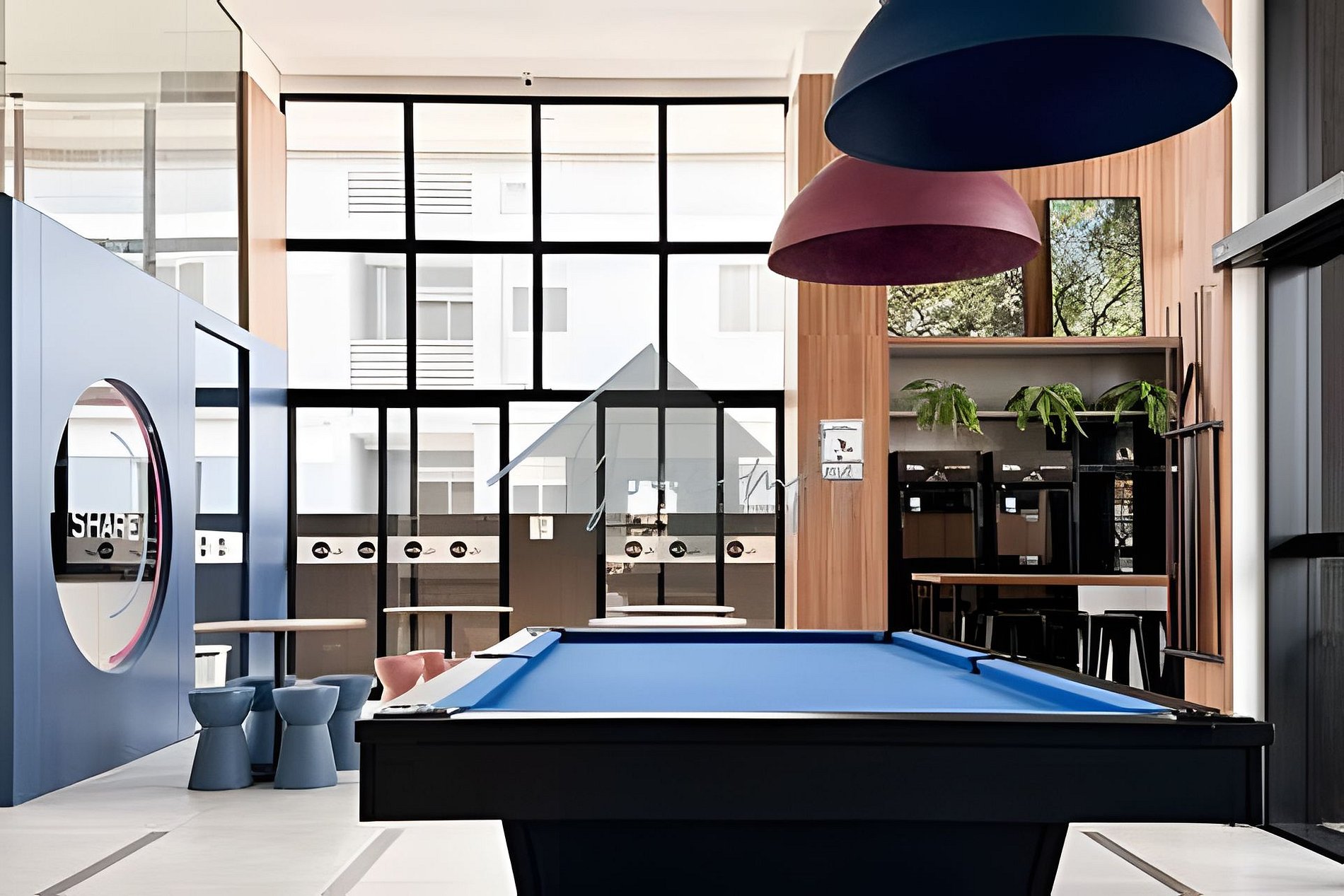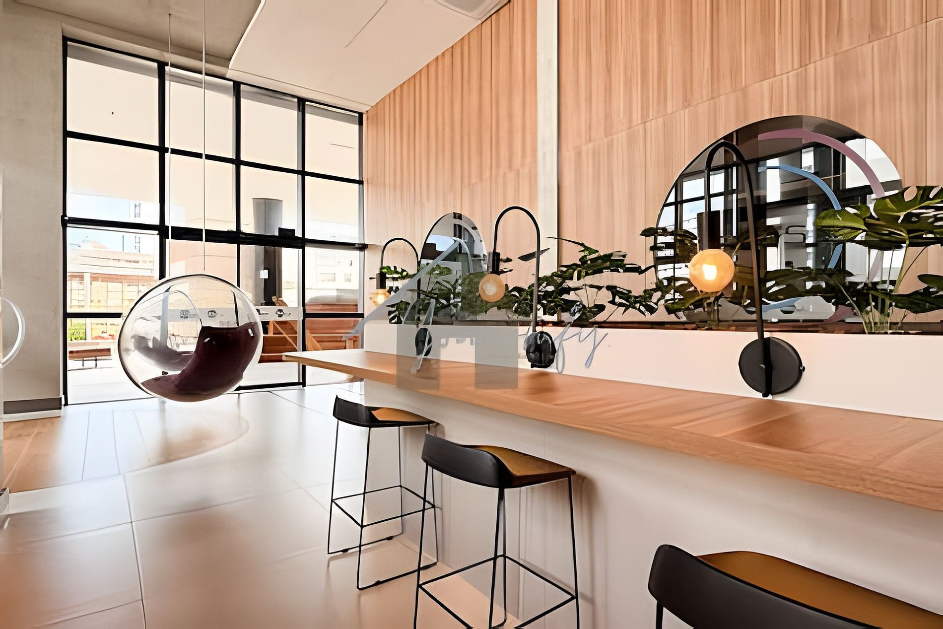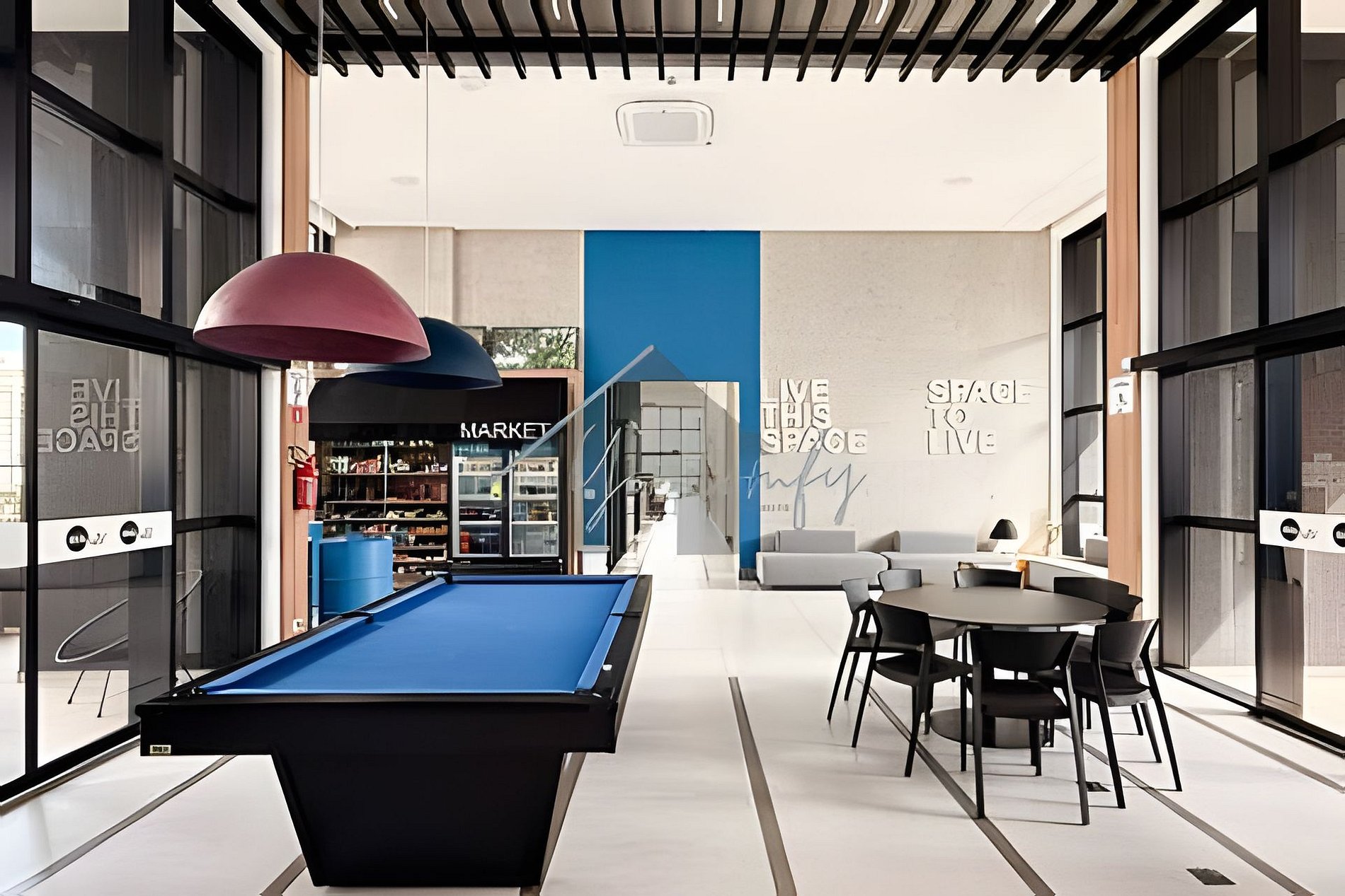 > Coworking: Aberto 24hrs por dia, em um amplo espaço com mesas, banquetas e puffs.